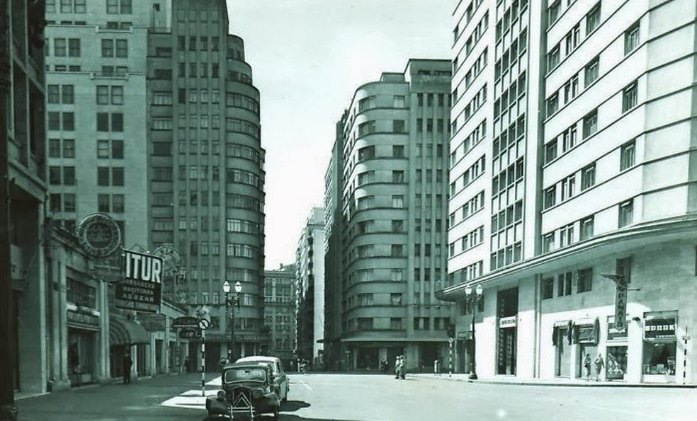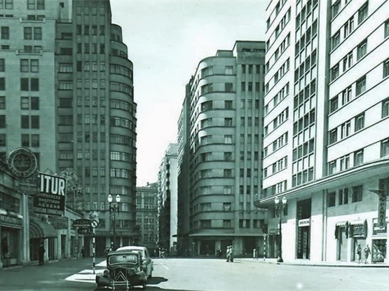 Esta característica de conjunto se estende à expressão formal dos edifícios. A evidência mais destacada desta preocupação se manifesta na confluência da Rua Marconi com a Sete de Abril. A forma dada aos edifícios Santa Leonor (1938 -1940) e Ângela Loureiro (1939-1940) ali realizados, parece sugerir obra de um mesmo autor, dada a sua semelhança. Isto, contudo, não ocorreu, pois o primeiro foi construído pela empresa Richter e Lotufo e o segundo pelo escritório Severo Villares. Apesar das diferenças de dimensões dos terrenos e mesmo de altura dos volumes, seus responsáveis buscaram estabelecer uma relação de intensa harmonia formal entre as duas obras, por meio movimento das linhas horizontais enfatizado pelas curvas de concordância das esquinas, repetidas de ambos os lados. Em contraponto, linhas verticais percorrem toda a extensão dos volumes, demarcando a porta de entrada da rua (Figura 3). Não bastasse esta intenção, outro edifício, situado na Rua Bráulio Gomes, na confluência da Rua Sete de Abril, mimetiza o mesmo tratamento, o que parece reafirmar a intenção estética do projeto urbano atrás mencionado.