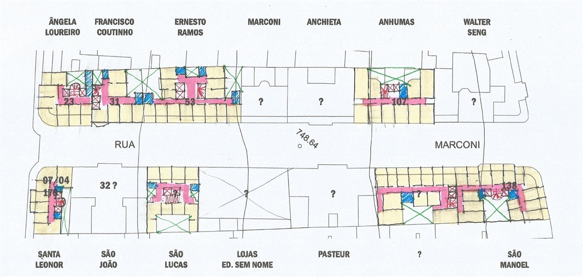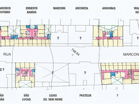 As salas de escritórios situadas nestes poços de ventilação encontram-se, em sua maioria, confinadas entre as paredes limítrofes, tendo como vista apenas as salas contíguas. Algumas destas situações conheceram respostas mais cuidadosas, buscando ampliar os limites destes pátios, como o demonstra o projeto que Jacques Pilon realizou para o edifício da família Silva Prado, contíguo à face noroeste da Rua Marconi, fazendo coincidir os pátios internos do novo edifício aos pátios pré-existentes dos Edifícios Walter Seng, Anhumas, Anchieta e Marconi (Figura 6).